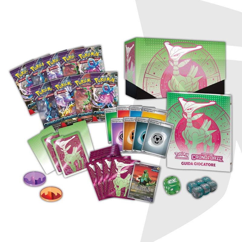 Il Set Allenatore Fuoriclasse dell’espansione Scarlatto e Violetto Cronoforze Fogliaferrea del GCC Pokemon contiene: